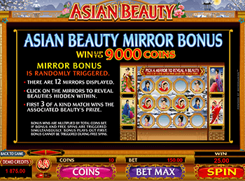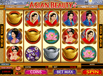 На экране симулятора Asian Beauty появляются изображения прекрасных жительниц азиатских стран. Также представлены картинки с сакурой, лотосом и чаш: серебряной и золотой. Два элемента наделены особыми возможностями. Вайлд – логотип аппарата, выполняет привычные функции. Он приносит выплаты за собственные комбинации и замещает другие картинки. Рассыпная пиктограмма приносит выигрыши, независимо от занимаемой ячейки. Символ также активирует раунд свободных вращений с дополнительным мультипликатором, удваивающим выплаты.